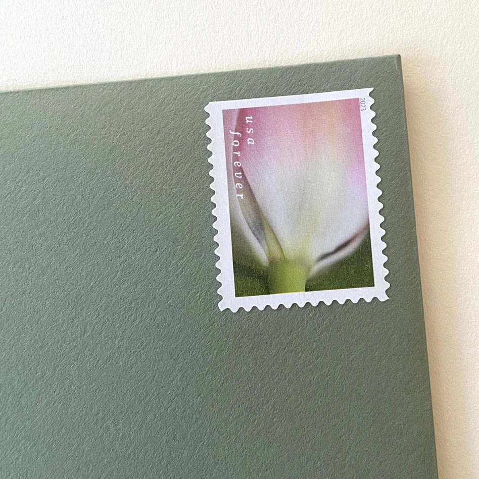 Enhance your wedding stationery and personal correspondence with this beautiful set of 10 Pink Flower Forever Stamps. Featuring a delicate white and pink floral design on a sage green background, these unused botanical stamps add a personalized, enchanting touch to your most important mailings.