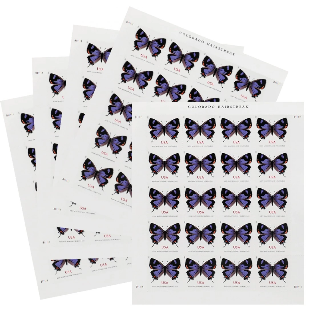 - Vibrant High-Resolution Imagery: The stamp features a stunning, scientifically accurate photographic reproduction of the Colorado Hairstreak butterfly. The rich, iridescent purple of its wings, contrasted with bright orange spots and a delicate black-and-white striped border, is rendered with exceptional clarity.
