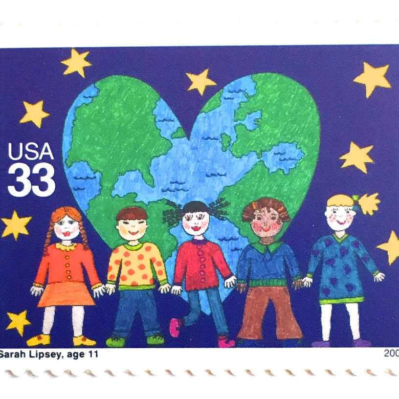 To celebrate the millennium back in 1999, the Postal Service sponsored a children’s stamp design contest called “Stampin’ the Future” based on imaginative space themes. This heart-shaped planet Earth design was one of the winning entries, making these Earth Day postage stamps both functional and historically significant.