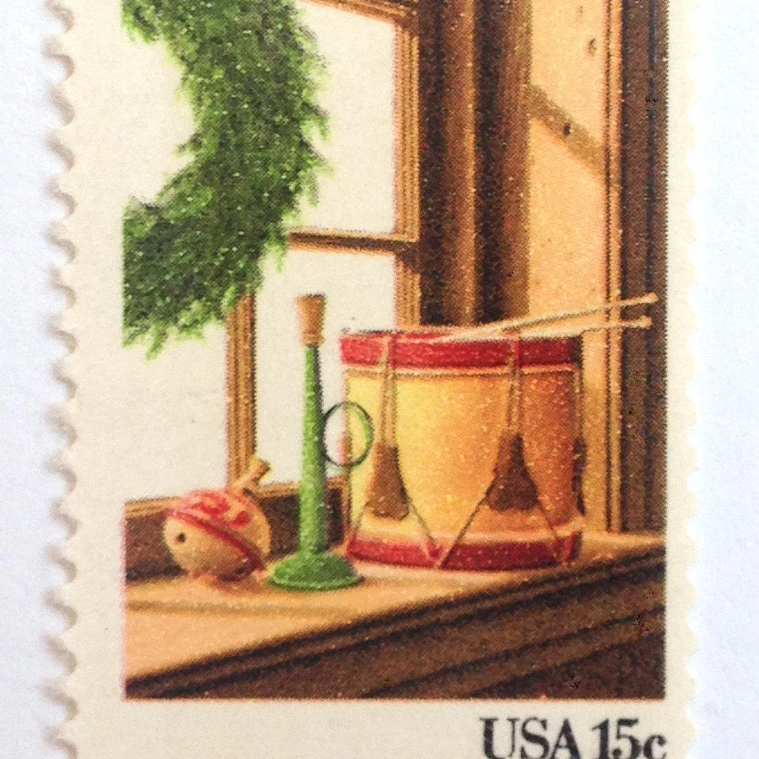These are genuine postage stamps issued in 1980 with a 15-cent face value and Scott catalog number 1843. The set includes ten identical stamps, each showcasing the festive toy shop wreath illustration that captures the spirit of Christmas past. As vintage postage stamps, they represent a piece of postal history while remaining functional for contemporary use.